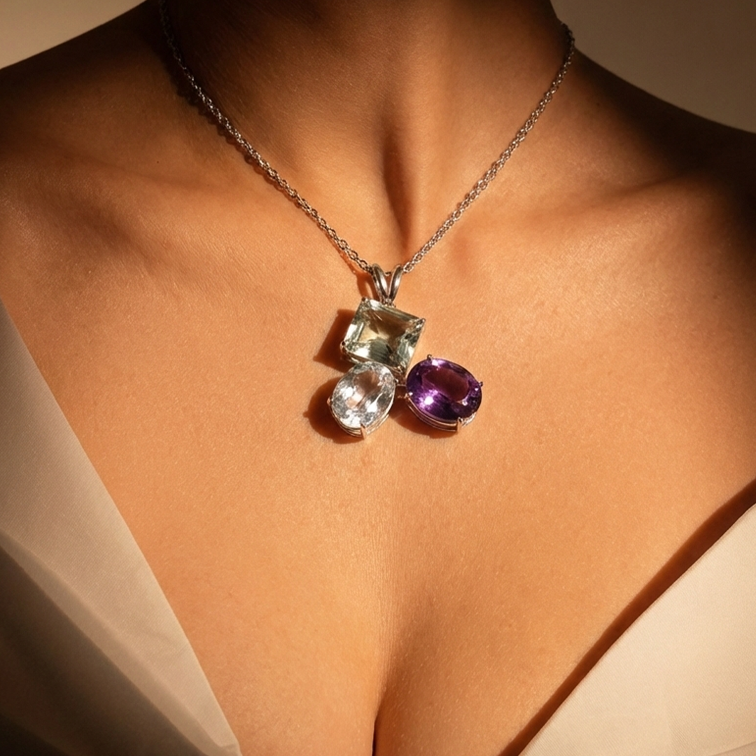 • Design: A luxurious multi-gemstone pendant featuring a striking octagon-cut Green Amethyst complemented by luminous White Quartz and rich purple Amethyst. Crafted in polished sterling silver, this piece offers a bold yet elegant statement look.